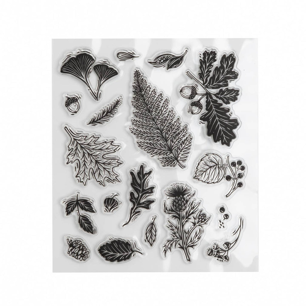 Forest Foliage Acrylic Stamp Set An 18-piece clear acrylic stamp set featuring hand-illustrated leaves, berries, seed pods, and botanical elements. Ideal for autumn-themed journaling, cardmaking, and seasonal spreads.